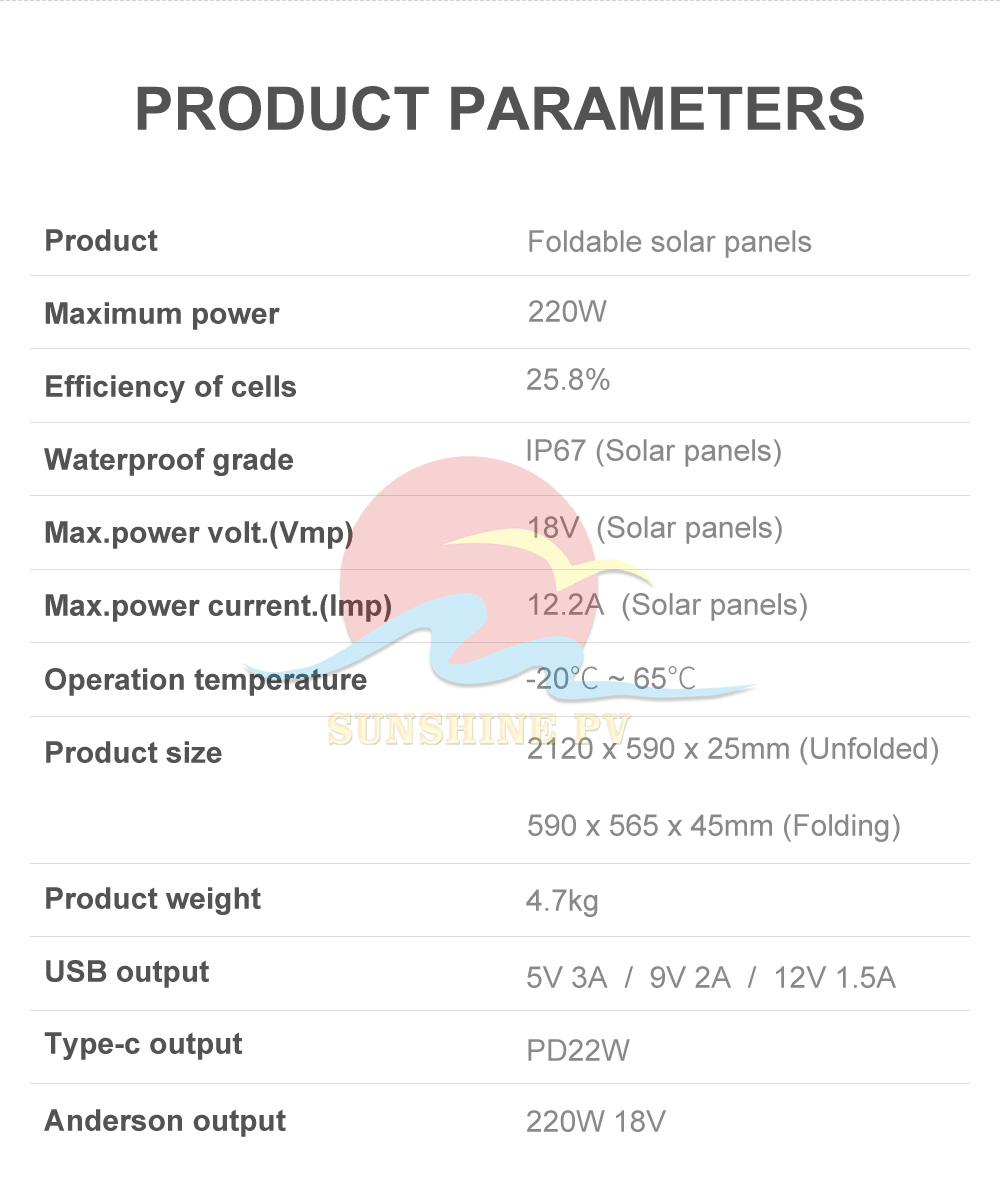 Super Light 220W Portable Solar Panel Camping Foldable Solar Blanket for Battery Phone Laptop USB DC Charge Product parameters