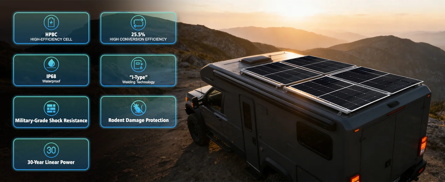 80W 100W 200W HPBC Solar Panel 26% High-Efficiency IP68 Rated for RV Home Off-Grid Roof Boat Marine Trailer Farm